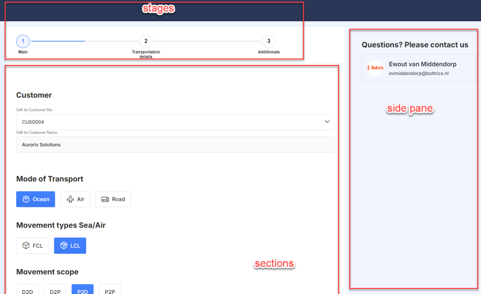 Avec la fonctionnalité de saisie de commandes, vous guidez vos clients pas à pas à travers le processus de saisie. Vous les dirigez via différentes étapes (stages) à travers plusieurs sections (sections) contenant des champs. Le type de section détermine la manière dont les champs sont présentés. Par exemple, les champs peuvent être affichés sous forme de questionnaire, en deux colonnes (par exemple, adresse de départ et d'arrivée), ou sous forme de saisie en lignes. Avec ce dernier format, il est également possible d'intégrer des lignes directement dans le formulaire.